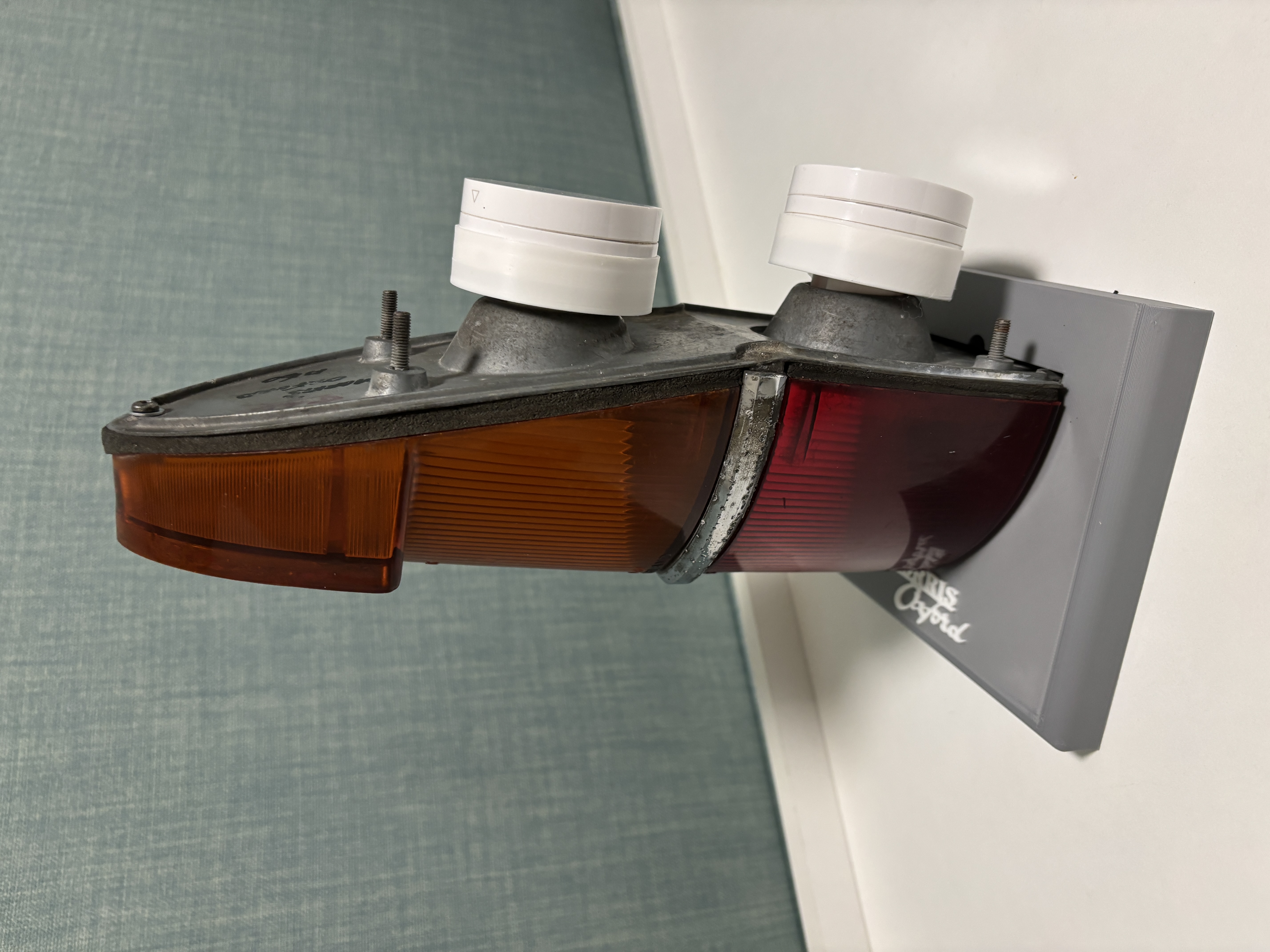 The lamp is mounted on a 3D printed base, incorporating the iconic Morris Oxford badge.