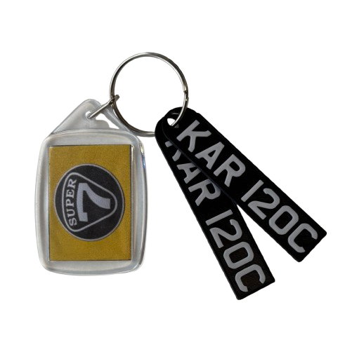 This Lotus key fob comes with the Prisoner's registration number KAR 120C in white 3D letters on a black base.
