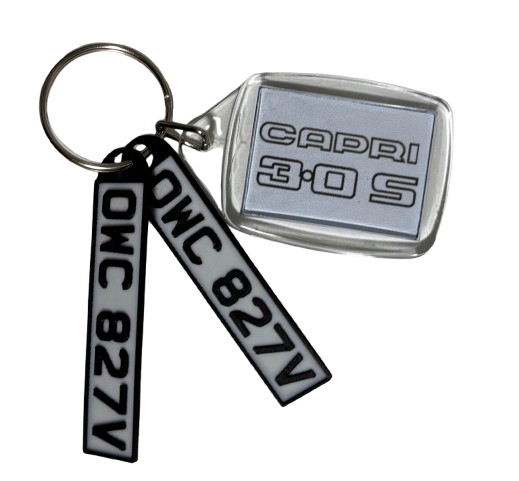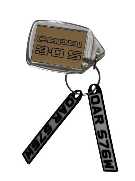 These Ford Capri 3.0S Key fobs come with Body or Doyle's registration numbers in black 3D letters on a white base.